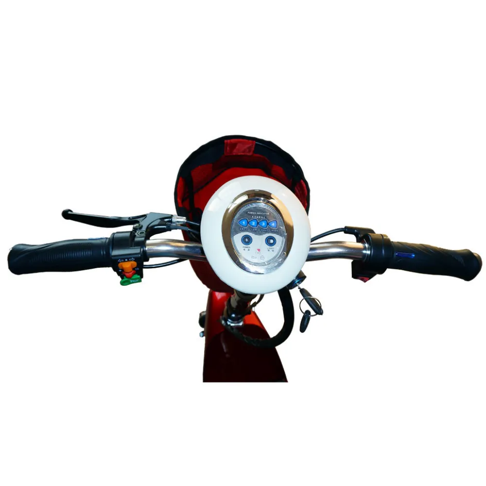 Модель оборудована оригинальным движком 350В типа мотор-колесо. Быстрый разгон до максимальных скоростных показателей 38 км/час обеспечивается свинцово-кислотной батареей (12 Ач). Телескопическая вилка на амортизаторах и сидение регулируются в зависимости от роста пользователя. Рама выполнена из особо прочной стали, легко выдерживает нагрузку до 110 кг. Шоссейные 12 дюймовые колеса имеют ярко выраженный протекторный рисунок для лучшего сцепления с дорожным полотном. Заряда батареи вполне хватит на поездку длиной в 40 км. Платформа для ног имеет высокие эргономические показатели и надежно фиксирует райдера при поездках. Стильная корзинка на руле предназначена для перевозки небольших грузов. Передний дисковый тормоз чувствительный и интуитивно простой в управлении.