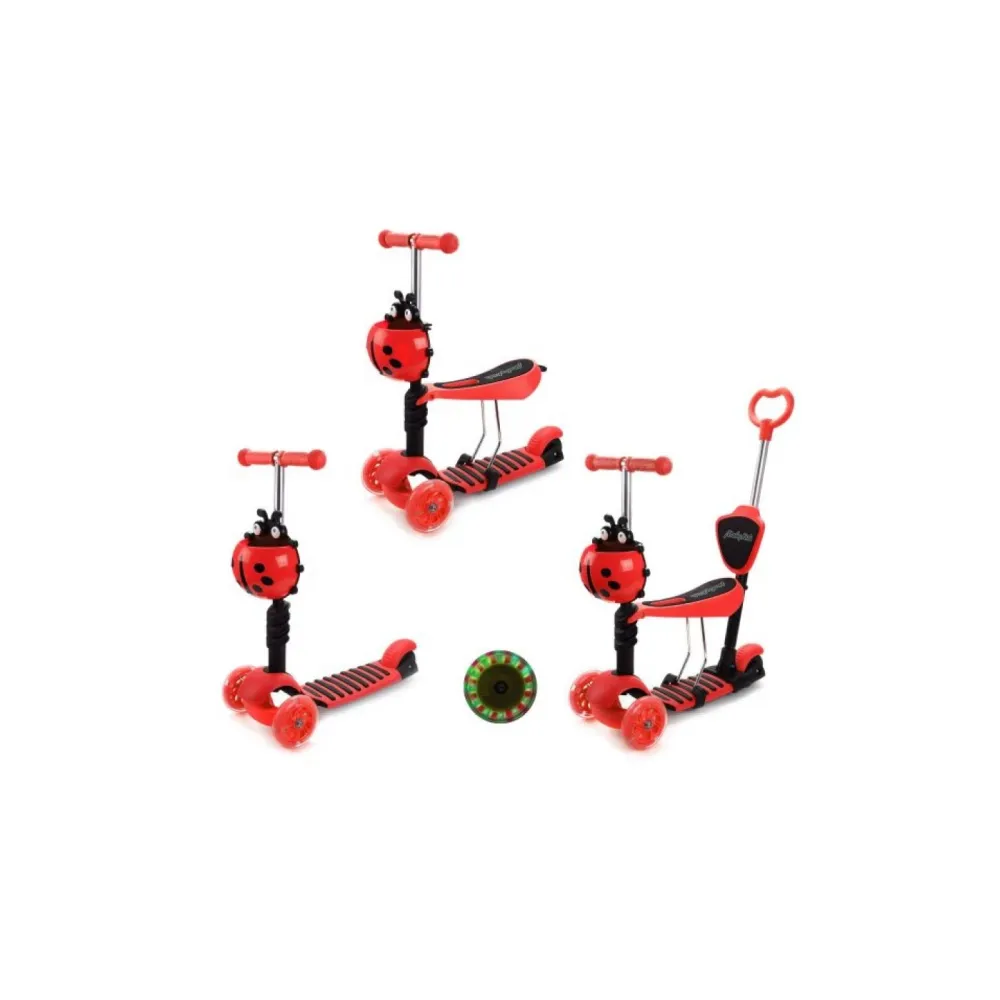 Детский самокат-трансформер Moby Kids 3 в 1 по достоинству оценят дети и их родители. Яркий привлекательный дизайн придётся по душе даже самым юным пользователям. Божья коровка на рулевой стойке выполняет не только декоративную функцию, но и служит для хранения мелких вещей. Данная модель представляет собой многофункциональный транспорт, которым могут пользоваться малыши возрастом от одного года. Управляет самокатом в данном случае взрослый при помощи специальной ручки, а ребенок может комфортно откинуться на мягкую спинку, держась за удобные ручки с ограничителем. Убрав ручку, вы получите беговел, на котором ребёнок передвигается сидя, попеременно отталкиваясь обеими ногами. После снятия сидения беговел превращается в настоящий самокат и ваш малыш может смело осваивать новый вид транспорта! Платформа с нескользящим покрытием обеспечивает устойчивое положение ног, позволяя ребёнку чувствовать себя безопасно и полностью сконцентрироваться на управлении. Два передних колёса оснащены светодиодами, которые излучают разноцветное сияние во время движения, радуя юного водителя при каждой поездке. Благодаря регулировке руля самокат «растет» вместе с ребёнком, что позволяет использовать одно транспортное средство в течение нескольких лет.