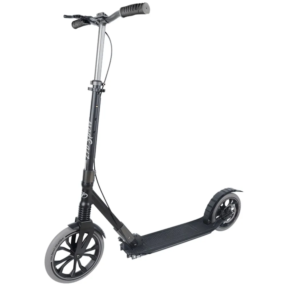 Рулевая часть широкая – 52 см. Возможна фиксация в трех положениях (100-115 см). Система складывания – стандартная. Тормозная система – ручная дисковая и задняя ножная. Дека – широкая, рабочая поверхность – большая, допускает установку двух ног одновременно. Материал покрытия – прорезиненный, износостойкий. В качестве комплектации к самокату прилагается ремень для переноски.